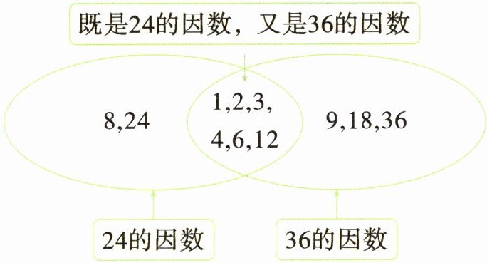 分析:列乘法算式找出 24 的因数,24 = 1×24 = 2×12 = 3×8 = 4×6,所以 24 的因数有 1,2,3,4,6,8,12,24。用同样的方法找出 36 的因数有 1,2,3,4,6,9,12,18,36。用集合图表示独有和公有的因数如下: