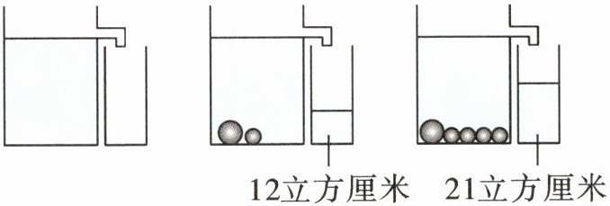 21 - 12 = 9(立方厘米) 9÷3 = 3(立方厘米) 12 - 3 = 9(立方厘米) 分析 从图中得出,从没有放铁球到放入一大一小两个铁球,溢出水的体积是12立方厘米,也就是说一大一小两个铁球的体积是12立方厘米。当放入一大四小五个铁球时,溢出水的体积是21立方厘米,也就是说一大四小五个铁球的体积是21立方厘米。由此可得出三个小铁球的体积是21 - 12 = 9(立方厘米),故一个小铁球的体积是9÷3 = 3(立方厘米)。用一大一小两个铁球的体积减去一个小铁球的体积,就是一个大铁球的体积,即12 - 3 = 9(立方厘米)。