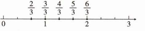 2. 先在直线上表示出$\frac{2}{3},\frac{3}{3},\frac{4}{3},\frac{5}{3}$和$\frac{6}{3}$,然后填空。