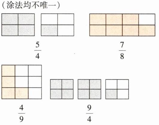 1. 根据分数涂色。(真分数涂橙色,假分数涂灰色)