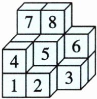 3. 下图中共有多少个小正方体?拿去几号小正方体,从正面、左面和上面看到的图形都不改变?