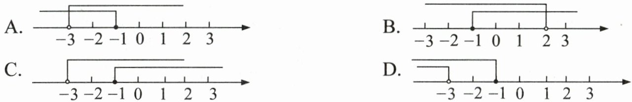 7. 不等式组$\begin{cases}\frac{3x - 1}{2} - 1 < 2x \\ x - 3(2x - 1) \geq 8\end{cases}$的解集在数轴上表示正确的是( )