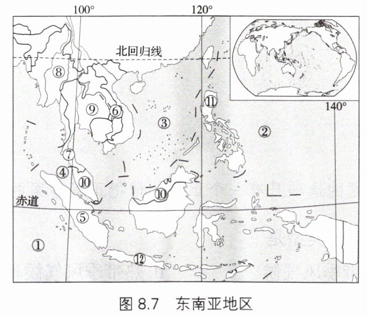 (1)①印度洋 ②太平洋 ③南海 (2)④马六甲海峡 (3)⑤苏门答腊岛 ⑥中南半岛 ⑦马来半岛 (4)⑧缅甸 ⑨泰国 ⑩马来西亚 ⑪菲律宾 ⑫印度尼西亚