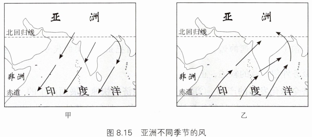 (1)甲图所示季节为______,此时印度盛行______(风向)风,降水______。