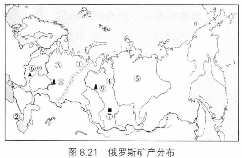 (3)俄罗斯矿产资源丰富,铁矿地⑥的名称是__________,煤矿⑦是__________,油田⑧是__________,油田⑨是__________。