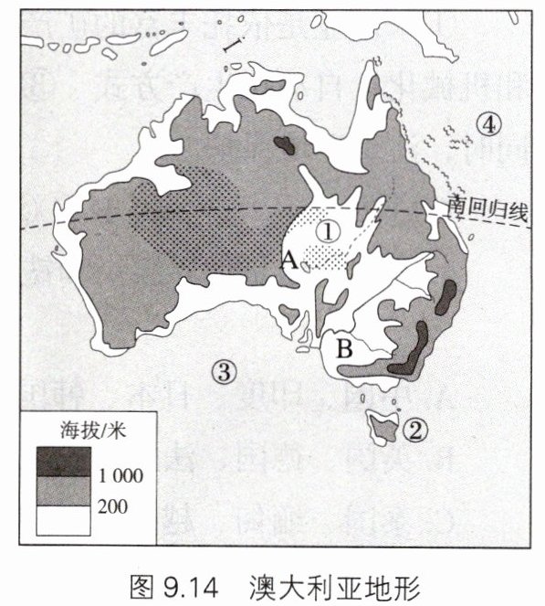 (2)澳大利亚东部、中部和西部的地形不同,东部有__________(山脉),中部是__________(地形类型),西部是__________(地形类型)。