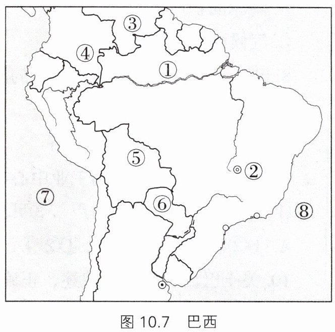 (1)①亚马孙平原 ②巴西高原 ③委内瑞拉 ④哥伦比亚 ⑤玻利维亚 ⑥巴拉圭 ⑦太平洋 ⑧大西洋(2)热带雨林气候 热带草原气候 平直(3)白种人比重大,混血种人数量较多。