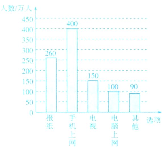 点拨:条形统计图能清楚地表示出各部分的具体数目,根据统计图提供的数据计算将报纸和手机上网作为获取新闻的主要途径的百分比,利用样本估计总体的思想计算该市中将报纸和手机上网作为获取新闻的主要途径的人数.