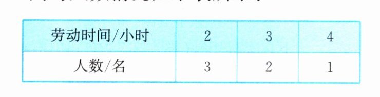 B 解析:由题表可以看出,关于劳动时间这组数据共有6个,即2,2,2,3,3,4. 根据中位数、众数的定义,平均数的公式可知,这组数据的中位数是2.5,众数是2,平均数是$\frac{2 + 2 + 2 + 3 + 3 + 4}{6}=\frac{8}{3}$,所以A,C选项错误,B选项正确. 根据方差的公式可知,这组数据的方差$s^2=\frac{1}{6}×[(2-\frac{8}{3})^2+(2-\frac{8}{3})^2+(2-\frac{8}{3})^2+(3-\frac{8}{3})^2+(3-\frac{8}{3})^2+(4-\frac{8}{3})^2]=\frac{5}{9}$,所以D选项错误.