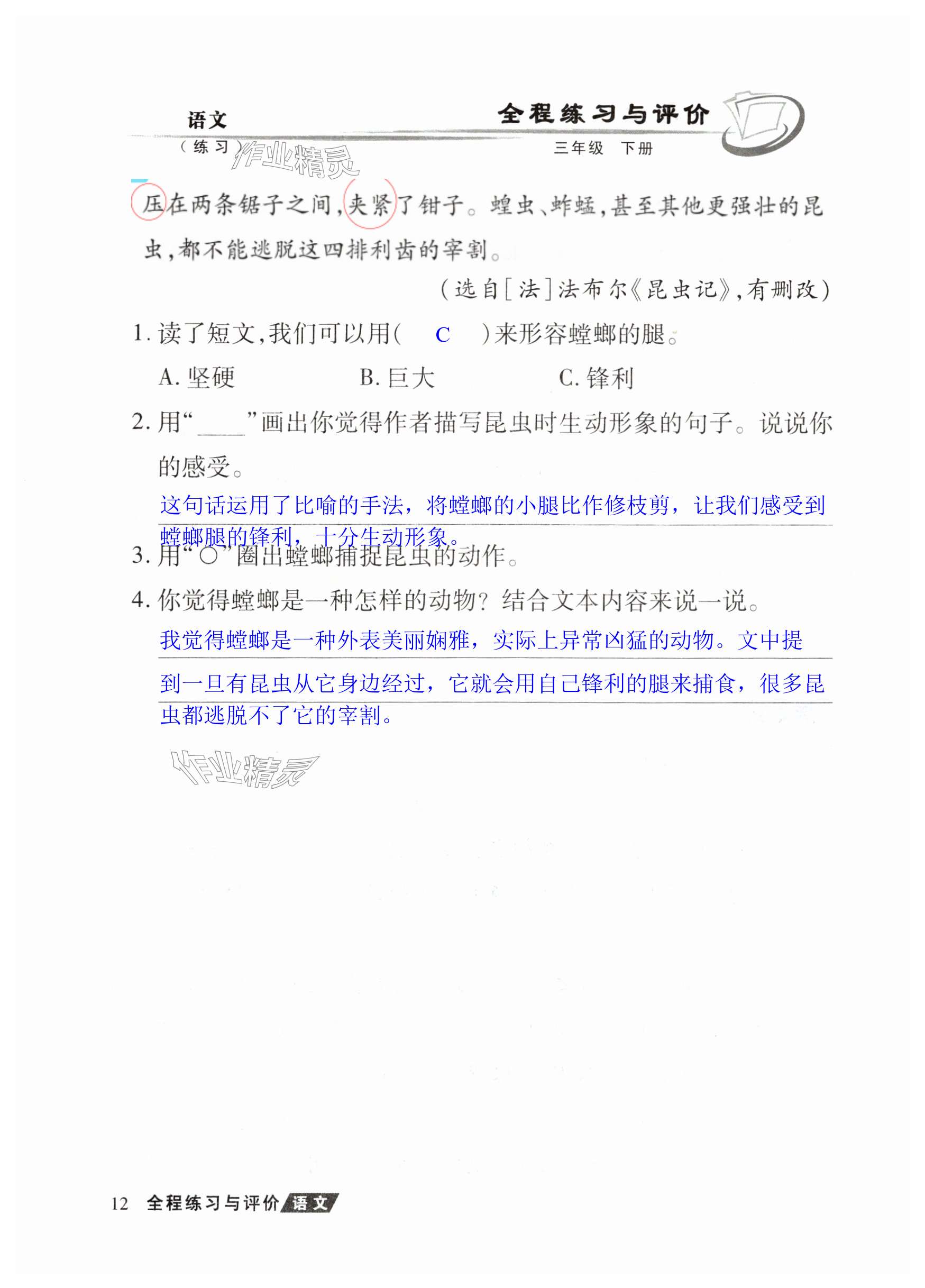 注:目前有些书本章节名称可能整理的还不是很完善,但都是按照顺序排列的,请同学们按照顺序仔细查找。练习册 2025年全程练习与评价三年级语文下册人教版练习版 答案主要是用来给同学们做完题方便对答案用的,请勿直接抄袭。