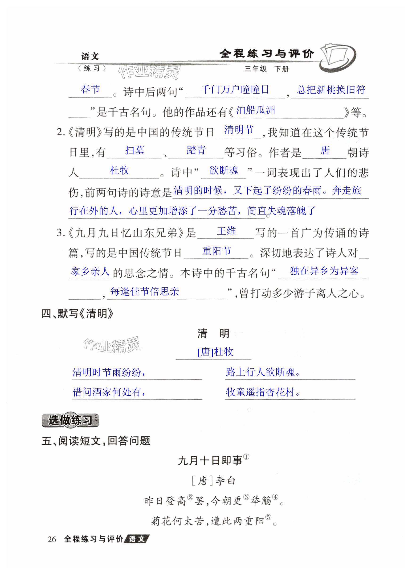 注:目前有些书本章节名称可能整理的还不是很完善,但都是按照顺序排列的,请同学们按照顺序仔细查找。练习册 2025年全程练习与评价三年级语文下册人教版练习版 答案主要是用来给同学们做完题方便对答案用的,请勿直接抄袭。