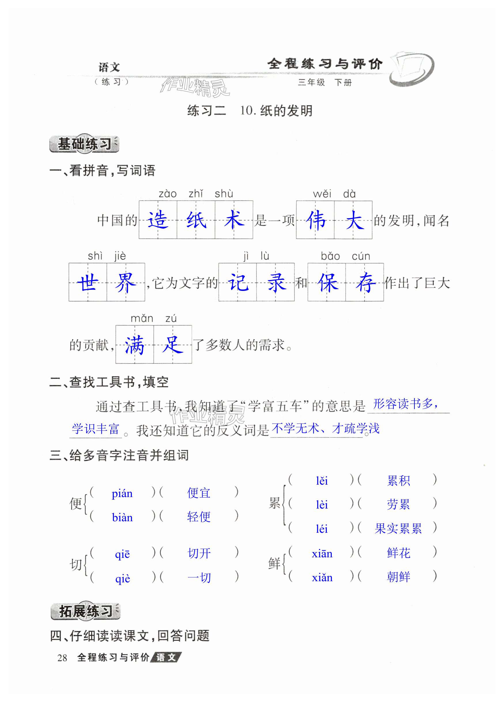 注:目前有些书本章节名称可能整理的还不是很完善,但都是按照顺序排列的,请同学们按照顺序仔细查找。练习册 2025年全程练习与评价三年级语文下册人教版练习版 答案主要是用来给同学们做完题方便对答案用的,请勿直接抄袭。