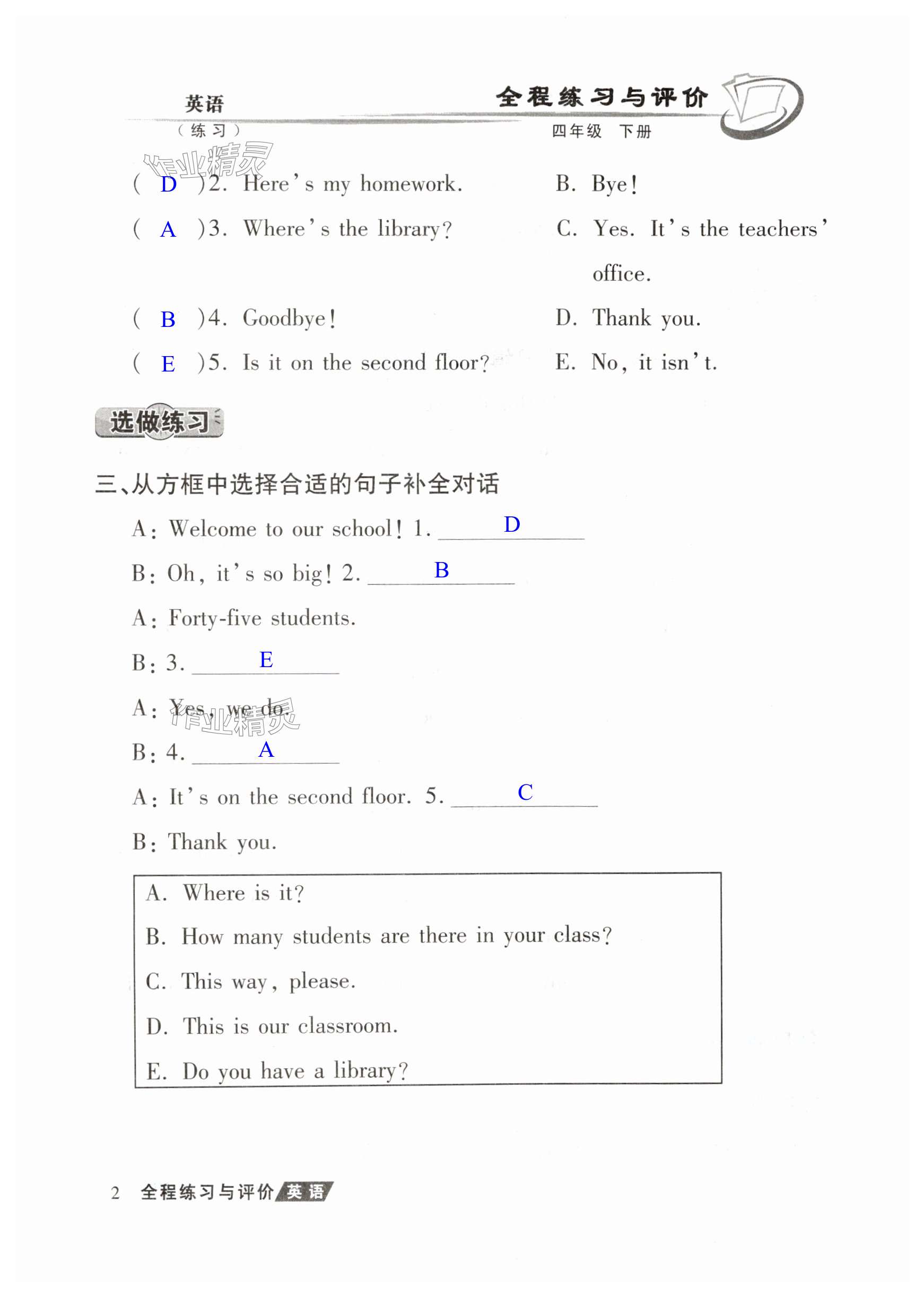 注:目前有些书本章节名称可能整理的还不是很完善,但都是按照顺序排列的,请同学们按照顺序仔细查找。练习册 2025年全程练习与评价四年级英语下册人教版练习版 答案主要是用来给同学们做完题方便对答案用的,请勿直接抄袭。