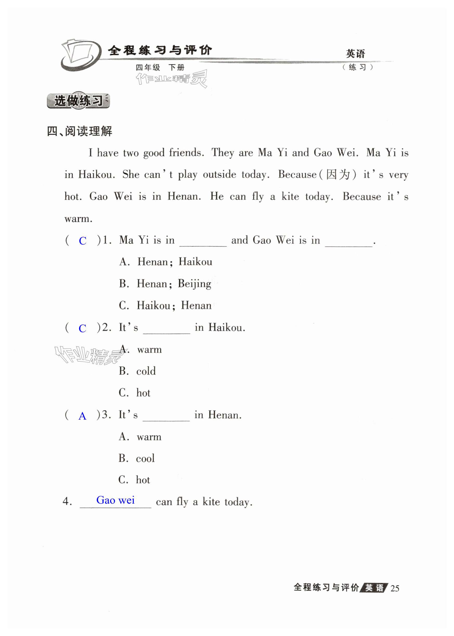 注:目前有些书本章节名称可能整理的还不是很完善,但都是按照顺序排列的,请同学们按照顺序仔细查找。练习册 2025年全程练习与评价四年级英语下册人教版练习版 答案主要是用来给同学们做完题方便对答案用的,请勿直接抄袭。