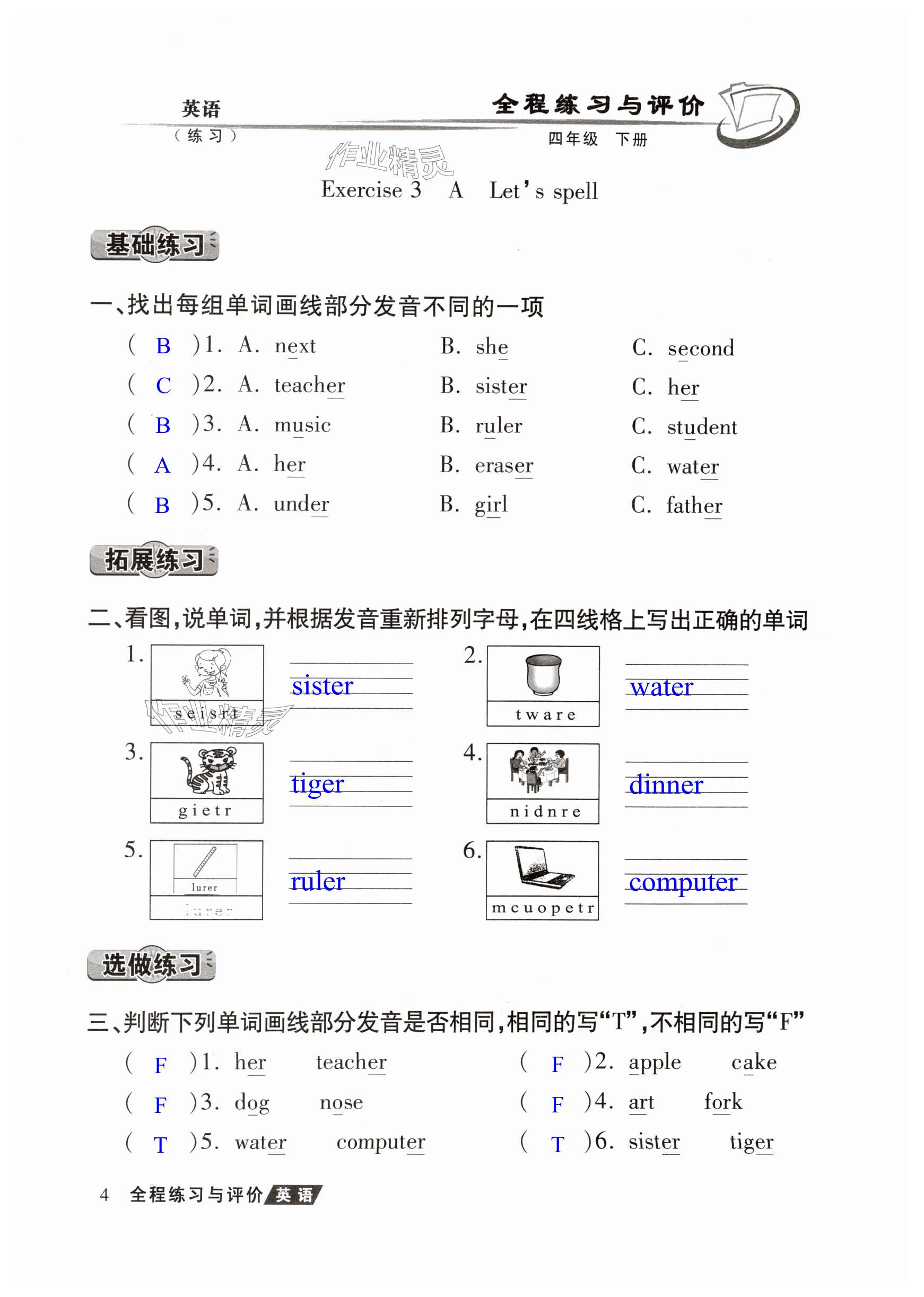 注:目前有些书本章节名称可能整理的还不是很完善,但都是按照顺序排列的,请同学们按照顺序仔细查找。练习册 2025年全程练习与评价四年级英语下册人教版练习版 答案主要是用来给同学们做完题方便对答案用的,请勿直接抄袭。
