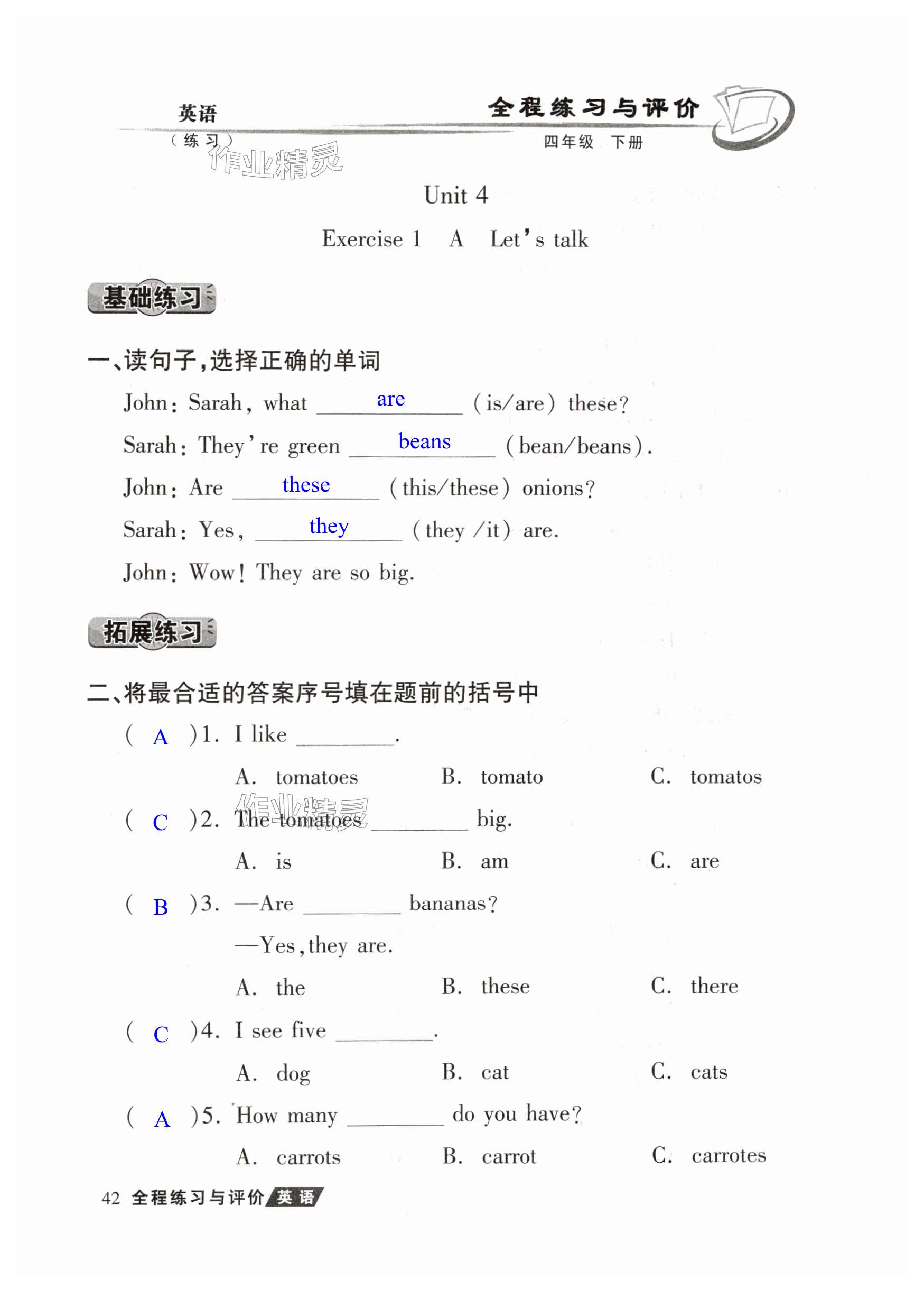 注:目前有些书本章节名称可能整理的还不是很完善,但都是按照顺序排列的,请同学们按照顺序仔细查找。练习册 2025年全程练习与评价四年级英语下册人教版练习版 答案主要是用来给同学们做完题方便对答案用的,请勿直接抄袭。