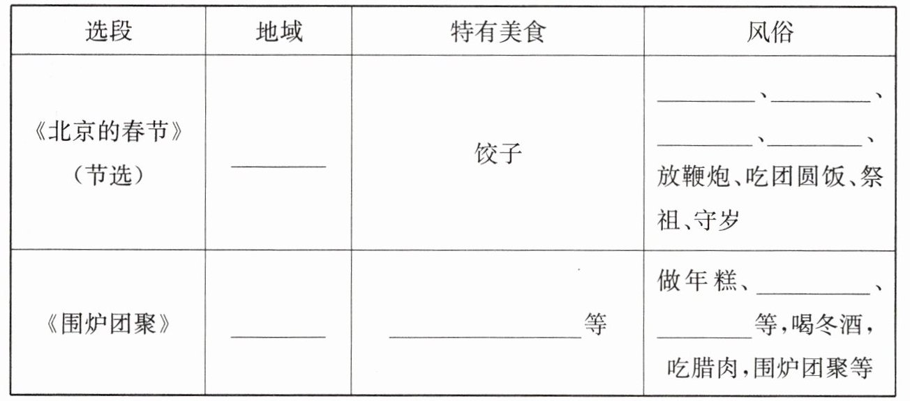 1. 选段(一)主要从_____觉、_____觉、_____觉等方面写出了 除夕的热闹 。选段(二)则重点介绍了 ____________________,描写得比较 _____(简略 详细),这样写的好处是 _____________________________________________