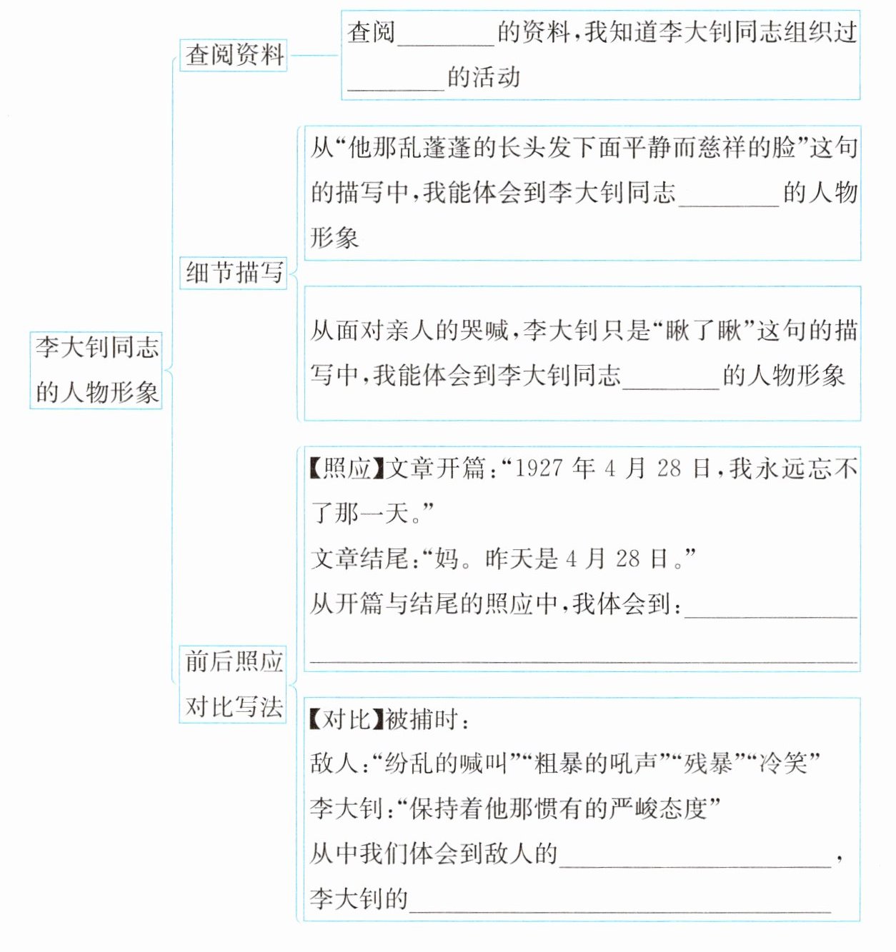 我们学习了《古诗三首》《十六年前的回忆》《为人民服务》《董存瑞舍身炸暗堡》四篇课文。我们不仅可以借助人物的外貌、神态、言行,体会人物的品质。还能通过查阅资料,进一步了解先烈的革命事迹,理解课文的关键词句。现在,我们一起来回顾课文,以《十六年前的回忆》为例,看看作者是如何透过文字表现人物品质的。