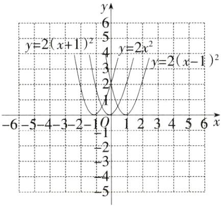 解:在平面直角坐标系中,画出y = 2x²的图象,y = 2x²的图象向右平移一个单位长度得y = 2(x - 1)²的图象,向左平移一个单位长度得y = 2(x + 1)²的图象.如图所示.