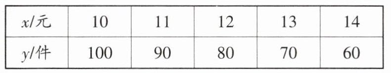 (1)设y与x的函数关系式是y = kx + b,由表得{10k + b = 100,11k + b = 90,解得{k = -10,b = 200,