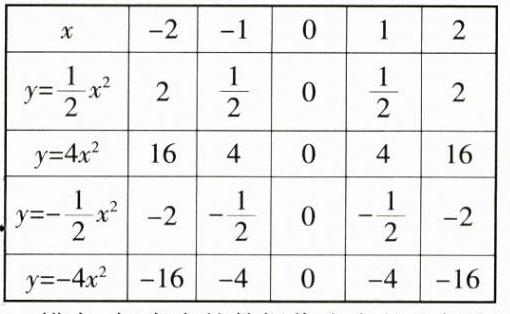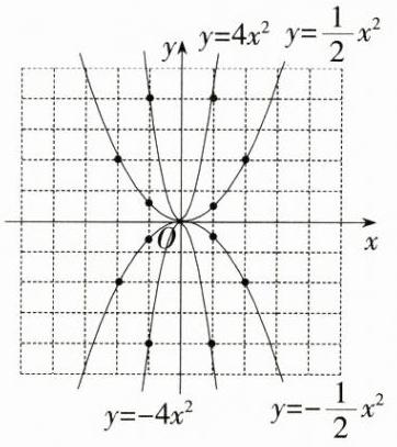 2. (教材P7,T1变式)在同一坐标系中,画出下列函数的图象:①$y=\frac{1}{2}x^{2}$;②$y = 4x^{2}$;③$y=-\frac{1}{2}x^{2}$;④$y = - 4x^{2}$。