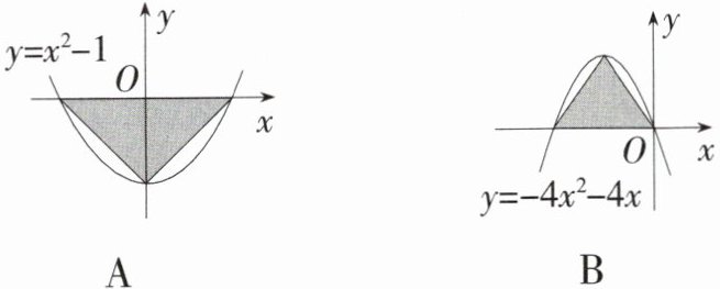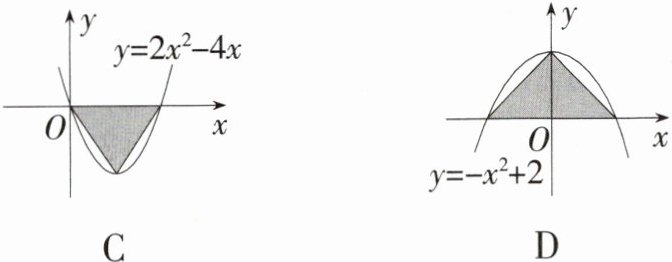 A 提示:A. 该抛物线与坐标轴交于点(-1,0),(1,0),(0,-1),故阴影部分的三角形是等腰直角三角形,其面积$S = \frac{1}{2}×2×1 = 1$;B. 该抛物线与$x$轴交于点(0,0),(-1,0),顶点坐标为$(-\frac{1}{2},1)$,故阴影部分的三角形是等腰三角形,其面积$S = \frac{1}{2}×1×1 = \frac{1}{2}$;C. 该抛物线与$x$轴交于点(0,0),(2,0),顶点坐标为(1,-2),故阴影部分的三角形是等腰三角形,其面积$S = \frac{1}{2}×2×2 = 2$;D. 该抛物线与坐标轴交于$(-\sqrt{2},0)$,$(\sqrt{2},0)$,(0,2),故阴影部分的三角形是等腰三角形,其面积$S = \frac{1}{2}×2\sqrt{2}×2 = 2\sqrt{2}$。