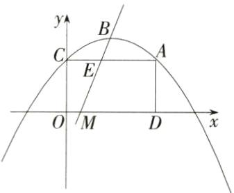 ∴四边形$ACOD$是矩形。设点$E$的坐标为$(m,3)$,直线$BE$的函数表达式为$y = kx + n$,直线$BE$交$x$轴于点$M$,如图所示,则$\begin{cases}2k + n = 4\\mk + n = 3\end{cases}$,解得$\begin{cases}k = -\frac{1}{m - 2}\\n = \frac{4m - 6}{m - 2}\end{cases}$,
