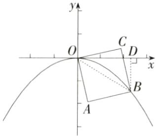 解:如图,连结$OB$,过点$B$作$BD\perp x$轴于点$D$,则$\angle BOC = 45^{\circ}$,$\angle BOD = 30^{\circ}$。已知正方形的边长为 1,则$OB = \sqrt{2}$。在$Rt\triangle OBD$中,$OB = \sqrt{2}$,$\angle BOD = 30^{\circ}$,则$BD = \frac{1}{2}OB = \frac{\sqrt{2}}{2}$,$OD = \frac{\sqrt{3}}{2}OB = \frac{\sqrt{6}}{2}$,故$B(\frac{\sqrt{6}}{2},-\frac{\sqrt{2}}{2})$。将$B$点坐标代入抛物线的解析式中,得$(\frac{\sqrt{6}}{2})^{2}a = -\frac{\sqrt{2}}{2}$,解得$a = -\frac{\sqrt{2}}{3}$。