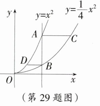 29. 如图,在平面直角坐标系中,垂直于$x$轴的直线分别交抛物线$y = x^{2}(x\geqslant0)$和抛物线$y=\frac{1}{4}x^{2}(x\geqslant0)$于点$A$和点$B$,过点$A$作$AC// x$轴交抛物线$y=\frac{1}{4}x^{2}$于点$C$,过点$B$作$BD// x$轴交抛物线$y = x^{2}$于点$D$,则$\frac{BD}{AC}$的值为 ( )