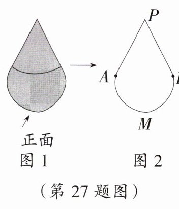 27.(河北中考)某款“不倒翁”(如图1)的主视图是图2,PA,PB分别与$\overset{\frown}{AMB}$所在圆相切于点A,B。若该圆半径是9 cm,∠P=40°,则$\overset{\frown}{AMB}$的长是 ( )