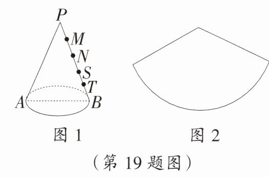 19. 已知AB是圆锥(如图1)底面的直径,P是圆锥的顶点,此圆锥的侧面展开图如图2所示.一只蚂蚁从A点出发,沿着圆锥侧面经过PB上一点,最后回到A点.若此蚂蚁所走的路线最短,那么M,N,S,T(M,N,S,T均在PB上)四个点中,它最有可能经过的点是 ( )