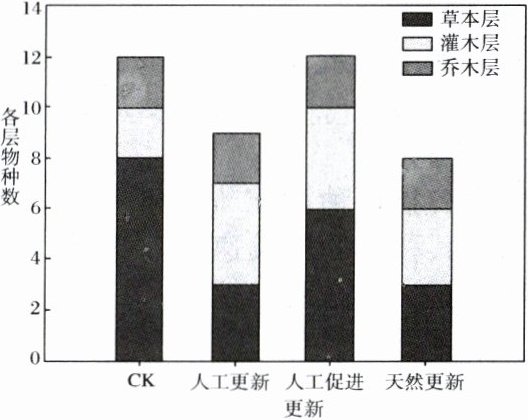5. 内蒙古大兴安岭森林火灾后,选择重度火烧迹地为研究区域,进行3种不同更新方式的实验研究。一段时间后,生态恢复的结果如图所示。CK为未发生火灾的对照组。下列说法错误的是 ( )
