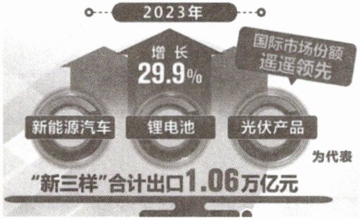 5 [2024 淮安模拟]以“新三样”为代表的高技术、高附加值、引领绿色转型的产品正在成为我国出口新的增长点。下图为 2023 年我国“新三样”出口数据。材料表明我国 ( )