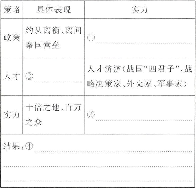 2. 六国诸侯攻秦的策略是什么?具体表现是什么?综合实力如何?在和秦国的较量中结果如何?完成下面的表格。