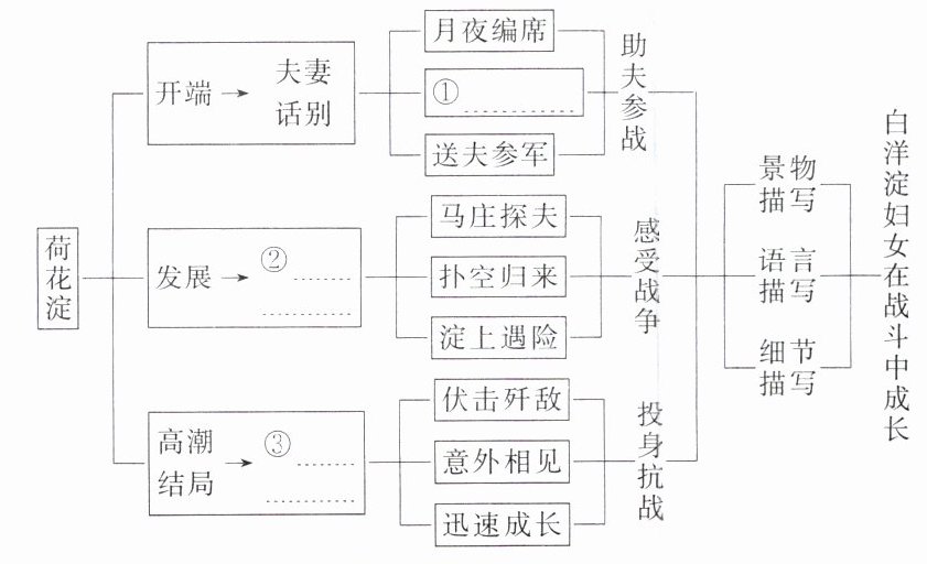 小说《荷花淀》以抗日根据地人民的抗日生活为背景,描述了以水生嫂为代表的白洋淀青年妇女①______________________________的过程,表现了抗日根据地人民②__________________________的精神。