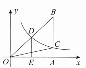8. 如图,已知双曲线$y = \frac{k}{x}$经过$Rt\triangle OAB$斜边$OB$的中点$D$,与直角边$AB$相交于点$C$,过点$D$作$DE\perp x$轴于$E$. 若$\triangle OBC$的面积为3,则$k$等于_________.