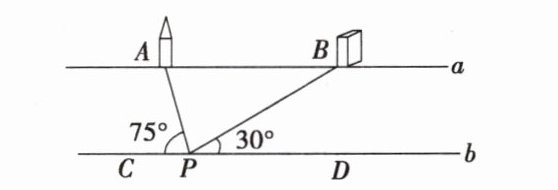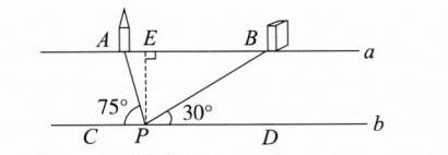 10. 如图,河流两岸 a,b 互相平行,点 A,B 是河岸 a 上的两座建筑物,点 C,D 是河岸 b 上的两点,A,B 的距离约为 200 米. 某人在河岸 b 上的点 P 处测得∠APC = 75°,∠BPD = 30°,则河流的宽度约为______米.