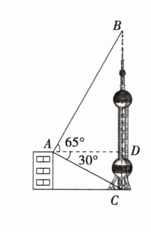 解:在Rt△ADB中,因为∠BAD = 65°,AD = 90,所以BD = AD·tan65°≈90×2.14 = 192.6,同理,在Rt△ADC中,因为∠DAC = 30°,AD = 90,所以CD = AD·tan30° = 90×√3/3≈51.9。所以BC = BD + CD = 192.6 + 51.9 = 244.5≈245(米)。所以电视塔BC的高度约为245米。