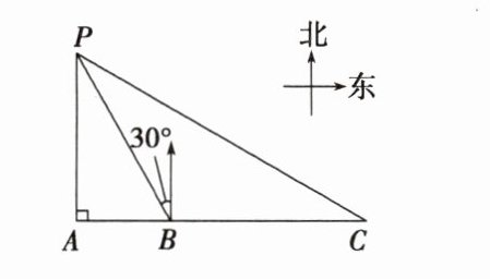 9. 如图,某海监船以 20 km/h 的速度在某海域执行巡航任务,当海监船由西向东航行至 A 处时,测得岛屿 P 恰好在其正北方向,继续向东航行 1 小时到达 B 处,这时,测得岛屿 P 在其北偏西 30°方向,则海监船到岛屿的最小距离是______km;保持航向不变,又航行 2 小时到达 C 处,此时海监船与岛屿 P 之间的距离(即 PC 的长)为______km(结果保留根号).