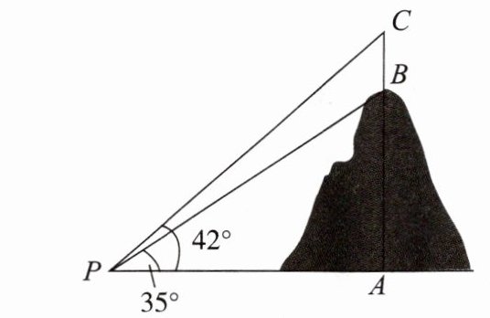 1. 如图,某座山$AB$的顶部有一座通信塔$BC$,且点$A,B,C$在同一条直线上. 从地面$P$处测得塔顶$C$的仰角为$42^{\circ}$,测得塔底$B$的仰角为$35^{\circ}$. 已知通信塔$BC$的高度为$32\ m$,求这座山$AB$的高度(结果取整数).