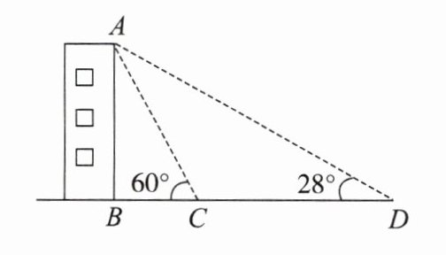 2. 如图,学校数学兴趣小组同学计划测量建筑物$AB$的高度,先在$D$处测得该建筑物顶端$A$的仰角为$28^{\circ}$,然后从$D$处前进$40\ m$到达$C$处,在$C$处测得该建筑物顶端$A$的仰角为$60^{\circ}$,点$B,C,D$在同一条直线上,且$AB\perp CD$. 求建筑物$AB$的高度(结果精确到$0.1\ m$).
