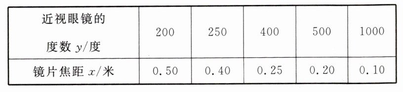 2. 验光师测得一组关于近视眼镜的度数$y$(单位:度)与镜片焦距$x$(单位:米)的对应数据如下表,根据表中数据,可得$y$关于$x$的函数解析式为( )