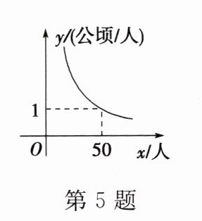 5. 某村耕地总面积为50公顷,且该村人均耕地面积$y$(单位:公顷/人)与总人口$x$(单位:人)的函数图象如图所示,则下列说法正确的是( )