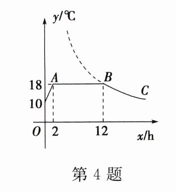 4. 在大棚中栽培新品种的蘑菇,在$18\ ^{\circ}C$的条件下生长最快,因此用装有恒温系统的大棚栽培,如图是某天恒温系统从开启升温到保持恒温及关闭的过程中大棚内温度$y$(单位:$^{\circ}C$)随时间$x$(单位:h)变化的函数图象,其中$BC$段是函数$y = \frac{k}{x}(k>0)$图象的一部分.若该品种蘑菇适宜生长的温度不低于$12\ ^{\circ}C$,则这天该品种蘑菇适宜生长的时间为( )