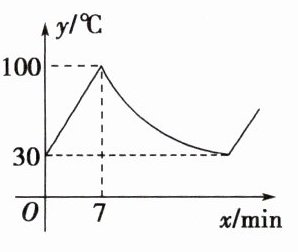 C 设反比例函数解析式为y = $\frac{k}{x}$,将(7,100)代入y = $\frac{k}{x}$,得k = 700,所以y = $\frac{700}{x}$,将y = 35代入y = $\frac{700}{x}$,得35 = $\frac{700}{x}$,解得x = 20,所以20 - 7 = 13(min),所以水温从100℃降到35℃所用的时间是13 min。