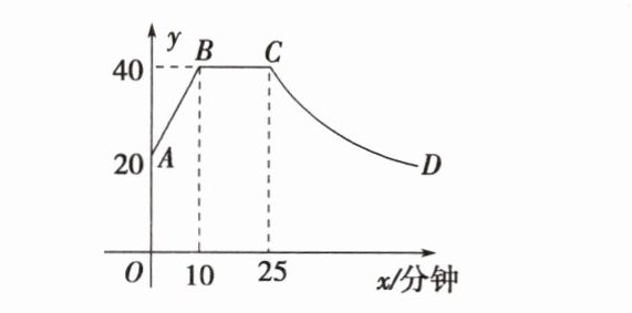 (1)设线段AB所在直线的解析式为y₁ = k₁x + 20,把B(10,40)代入得,k₁ = 2,所以y₁ = 2x + 20,设CD所在双曲线的解析式为y₂ = $\frac{k₂}{x}$,把C(25,40)代入得,k₂ = 1000,所以y₂ = $\frac{1000}{x}$,当x = 5时,y₁ = 2×5 + 20 = 30,当x = 30时,y₂ = $\frac{1000}{30}$ = $\frac{100}{3}$,所以y₁<y₂,所以第30分钟时,学生的注意力更集中;