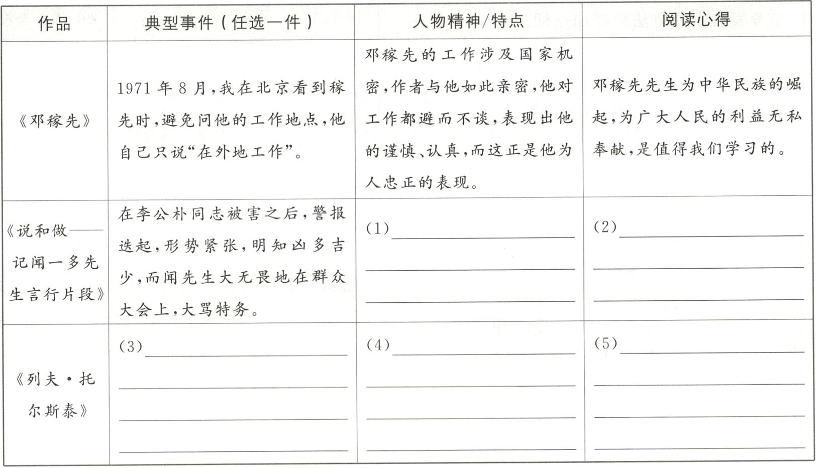 1. 通读本单元三篇现代文,梳理典型事件,感受人物精神或特点。仿照《邓稼先》一课,填写表格。