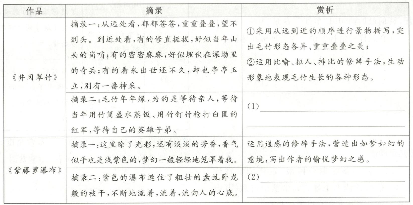 2.【“写景状物”专栏】本单元的两篇现代文堪称写景状物的典范,请赏析从两篇文章中摘录的写景句子。
