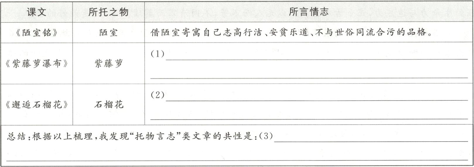1.【“托物言志”专栏】本单元有几篇托物言志的课文,请借助下表进行回顾。