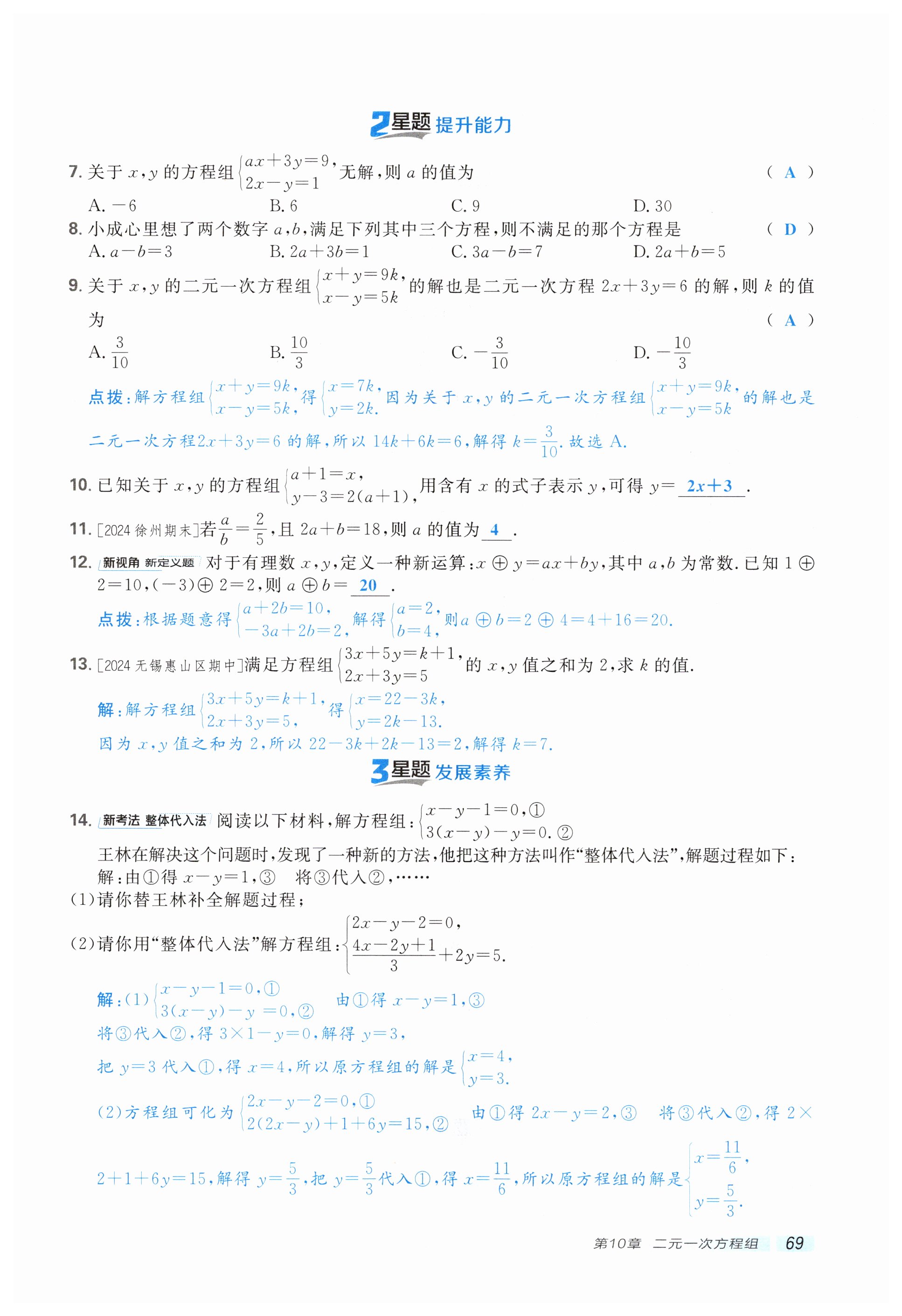 注:目前有些书本章节名称可能整理的还不是很完善,但都是按照顺序排列的,请同学们按照顺序仔细查找。练习册 2025年点拨训练七年级数学下册苏科版 答案主要是用来给同学们做完题方便对答案用的,请勿直接抄袭。